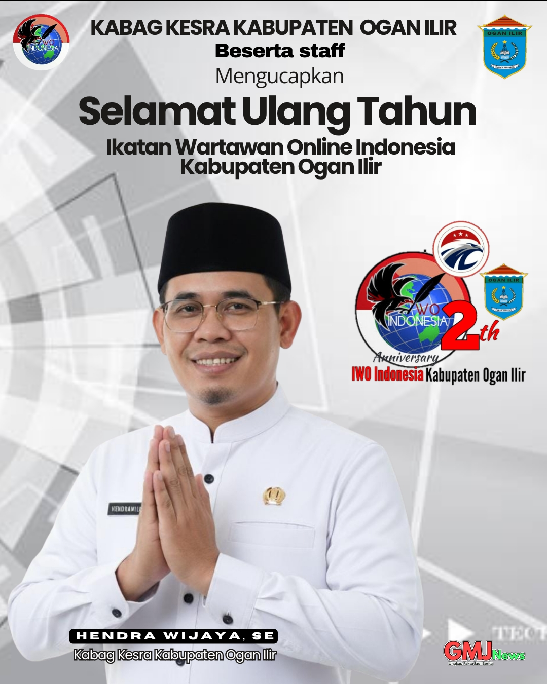 OGAN ILIR, kabarrthreenka.com- Kepala Bagian (Kabag) Kesejahteraan Rakyat Setda Kabupaten Ogan Ilir (OI) Hendra Wijaya, SE mengucapkan selamat Hari Ulang Tahun (HUT) ke 2 tahun Ikatan Wartawan Online Indonesia (IWO-I) Kabupaten Ogan Ilir (OI).
