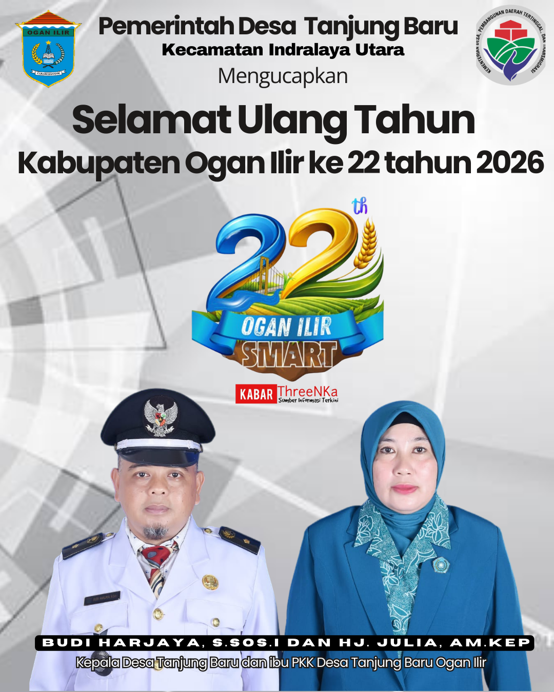 OGAN ILIR, kabarrthreenka.com- Pemerintah Desa Tanjung Baru Kecamatan Indralaya Utara Kabupaten Ogan Ilir Bapak Budi Harjaya, S.Sos.I dan istri Ibu Hj. Julia, Am.Kep selaku ketua TP PKK Desa Tanjung Baru mengucapkan Selamat Ulang Tahun Kabupaten Ogan Ilir (OI) ke 22 tahun 2026, 7 januari 2026.