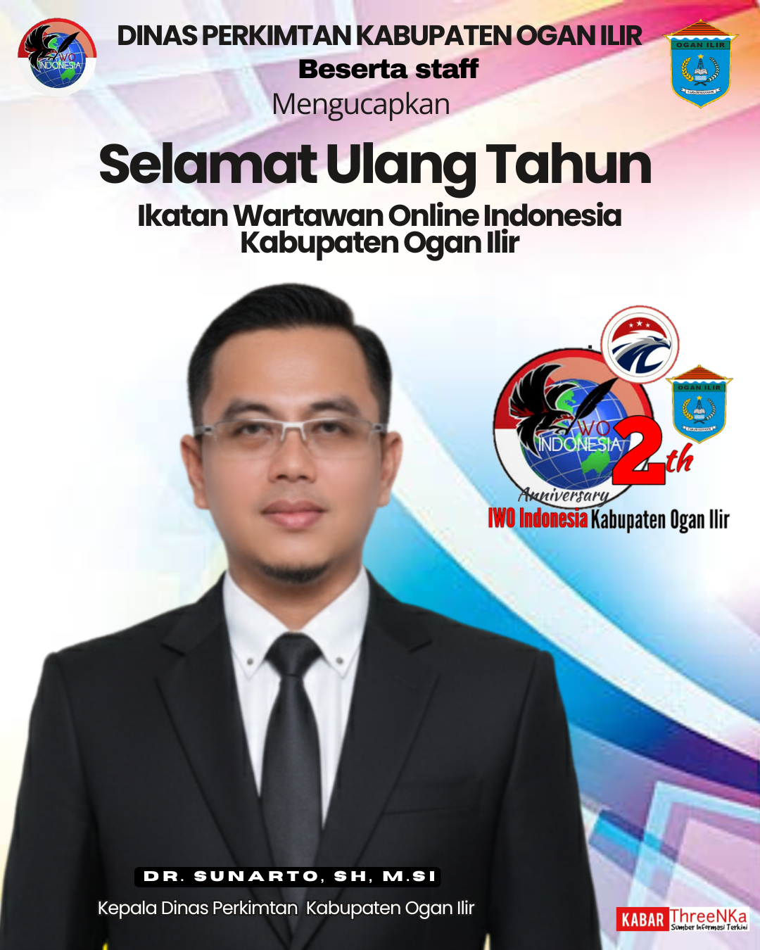 OGAN ILIR, kabarrthreenka.com- Kepala Dinas Perumahan Rakyat dan Permukiman serta Pertanahan (Disperkimtan) Kabupaten Ogan Ilir (OI) DR. Sunarto, SH, M.Si mengucapkan selamat Hari Ulang Tahun (HUT) ke 2 tahun Ikatan Wartawan Online Indonesia (IWO-I) Kabupaten Ogan Ilir (OI).